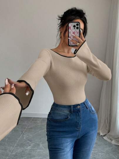 Selianne 休闲优雅时尚百搭镶嵌饰边效果喇叭袖套头衫,适合女士,秋冬春 - 卡其色 - 查看 2