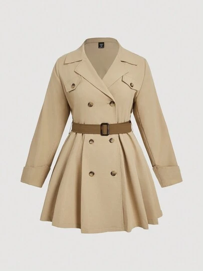 SHEIN MOD 加大码卡其色复古拼色系腰褶下摆长款女式风衣,优雅办公室风衣 - 卡其色 - 查看 1