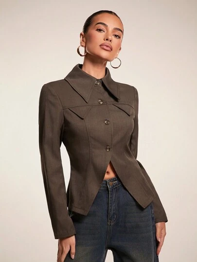 Glamine 女式前开衩优雅长袖夹克,女式纯色,时尚女式圣诞服装,感恩节百搭秋季外套 - 棕色 - 查看 1
