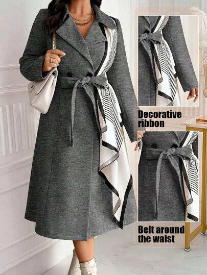 SHEIN Unity 大码休闲双排扣大衣,适合户外和通勤、秋季和冬季 - 深灰色 - 查看 2