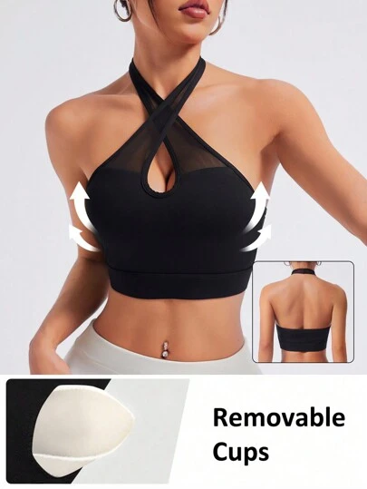 Easithlete 女士纯色网眼对比交叉吊带运动胸罩 - 黑色 - 查看 1