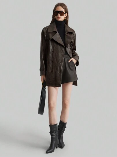 Ontre 女士 2025 新款棕色春季新年翻领口袋腰带都市时尚 PU 夹克 - 棕色 - 查看 10