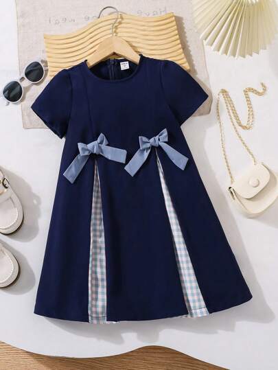 SHEIN LMoss Kids LMoss 年轻女孩休闲夏季拼色印花蝴蝶结圆领短袖连衣裙,非常适合休闲和日常穿着 - 藍色 - 查看 1