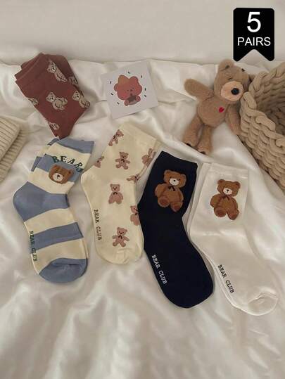 5 双女士熊图案中筒袜,可爱卡通日式长筒袜适合春夏秋冬日常穿着 - 彩色 - 查看 1