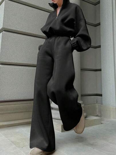 INAWLY 2 件女式休闲纯色拉链连帽衫和裤子套装,秋季 - 黑色 - 查看 1
