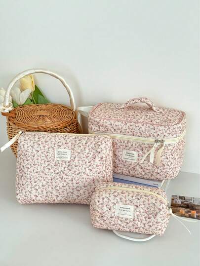 全身花卉灯芯绒化妆包,花卉印花面料拉链袋,可爱的乡村风格洗漱用品收纳袋,适合日常、居家或旅行使用 - 粉色 - 查看 10