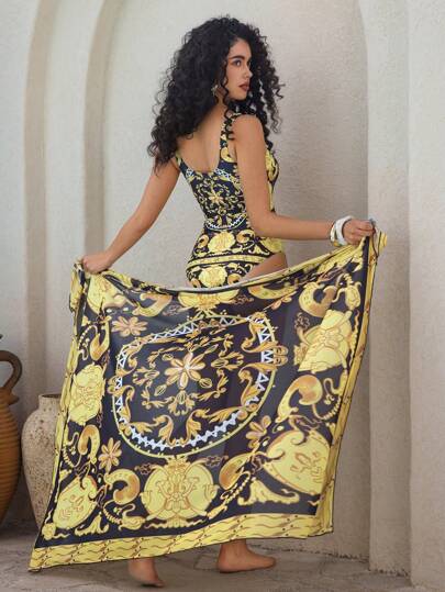 Swim Oasis 夏季 2 件套 女士 印花 方领 高腰 连体泳衣 和 裙子 度假 - 彩色 - 查看 1
