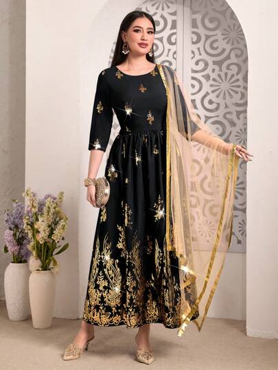 Divindia 网眼拼接圆领中长袖上衣和 A 字裙套装,采用极简印花图案 - 黑色 - 查看 1