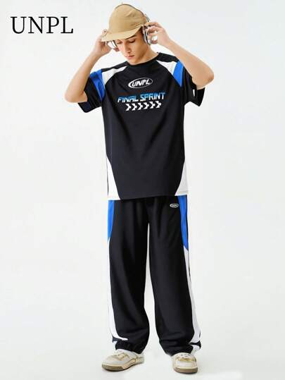 SHEIN 2 件青少年夏季服装:宽松嘻哈图案印花短袖 T 恤和条纹运动跑步裤,适合街头、舞台和运动 - 彩色 - 查看 5