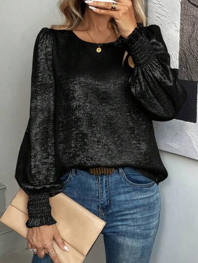 SHEIN LUNE 女士金箔圆领灯笼袖衬衫 - 黑色 - 查看 1