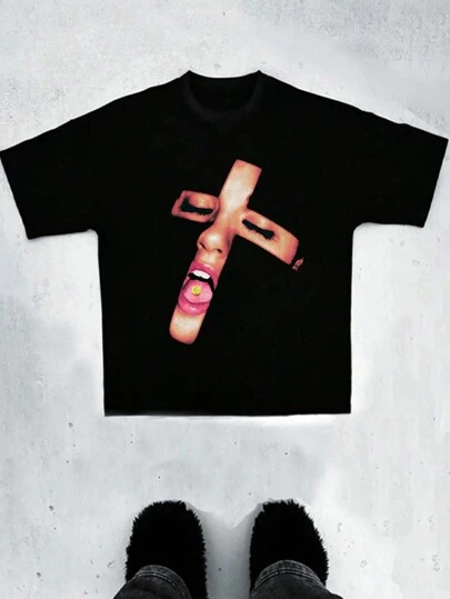 大码男士图案印花圆领短袖休闲 T 恤,夏季 - 黑色 - 查看 1