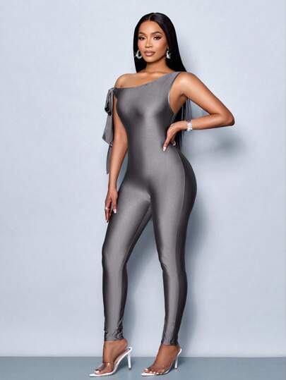 SOLERSUN 女士纯色不对称领口紧身连身裤休闲日常穿着 - 灰色 - 查看 1