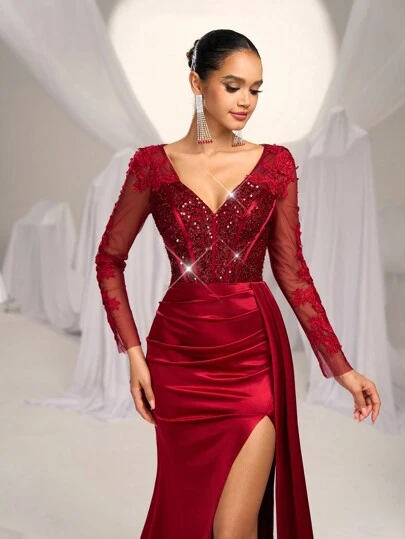 Glamrae 优雅奢华 V 领透视长袖蕾丝花朵贴花亮片鱼尾下摆缎面褶皱开叉晚礼服,带有飘逸侧片,适合婚礼、单身派对、庆典、正式活动、派对礼服、礼服 - 酒紅色 - 查看 1