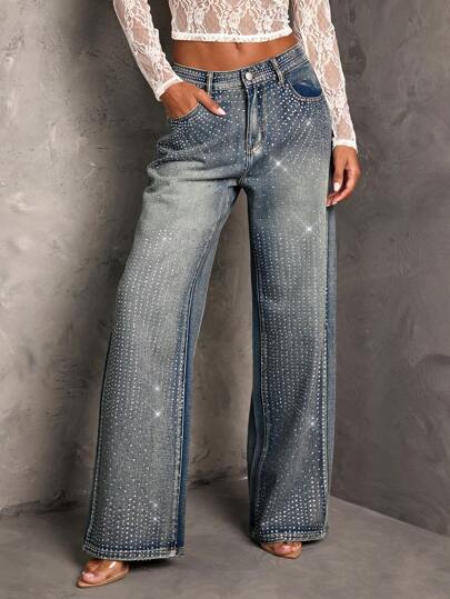 SHEIN BAE 女士水钻装饰直筒蓝色牛仔裤 - 中等水洗藍 - 查看 1