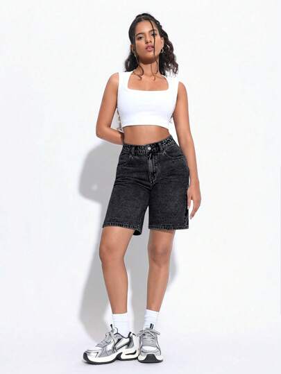 SHEIN PETITE 女式前扣口袋休闲宽松牛仔短裤 - 深灰色 - 查看 1