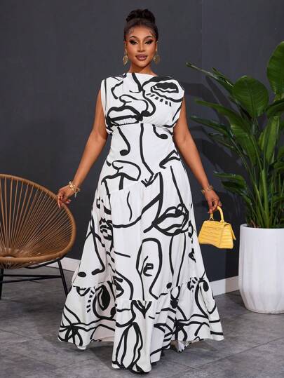 Slaydiva 大码女式抽象脸部线条艺术印花无袖休闲连衣裙 - 彩色 - 查看 1