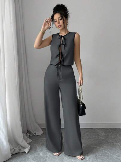 Siren Gaze 春夏女装绑带上衣套装拼色蝴蝶结女上衣纯色休闲宽松长裤女士两件套日常休闲职场通勤装工作服女 - 灰色 - 查看 2