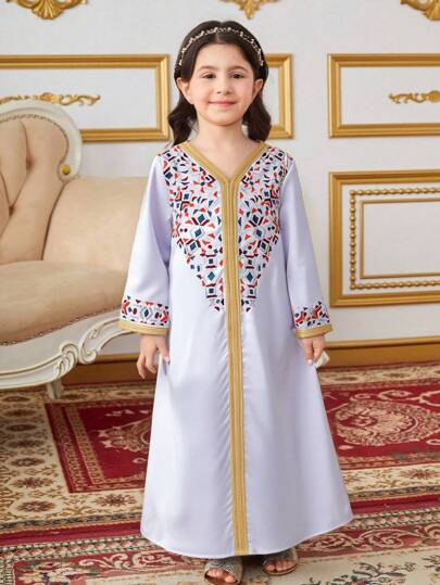 SHEIN 年轻女孩斋月传统长袍宽松几何复古印花拼布金丝带 V 领长袖连衣裙,适合派对、婚礼、宴会、度假、夏季 - 藍色 - 查看 1