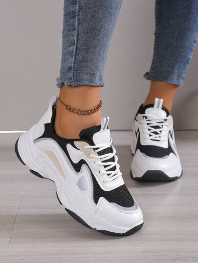 2025年秋季女款运动鞋新款圆头系带拼色时尚运动鞋,厚底 - 米色 - 查看 2