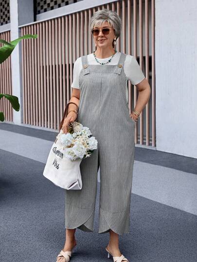 EMERY ROSE 大码休闲条纹连体裤带围兜春季女装度假装 - 黑色 - 查看 1