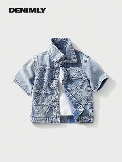 YOUNG BOY 休闲户外街头装破洞纽扣前牛仔衬衫,带刺绣和磨损细节 - 淺色水洗藍 - 查看 1