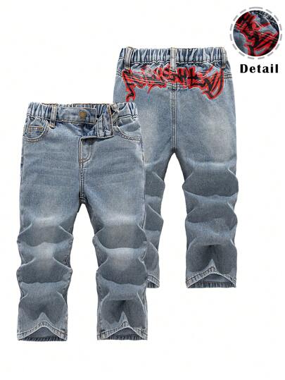 SHEIN 小男孩做旧洗水红色涂鸦图案复古宽松蓝色牛仔裤,适合儿童春夏服装和街头服装 - 淺色水洗藍 - 查看 1