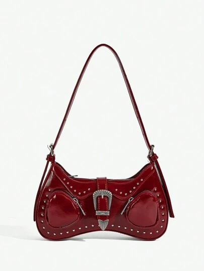 SHEIN X Lucía Bellido SHEIN ICON 女士、女式单肩包、流浪包、时尚、个性、简约、百搭、街头、甜美酷炫女孩、辣妹、Y2K、复古、铆钉、复古、青少年、Y2K 包、2000 年代时尚风格、哥特朋克女包 - 酒紅色 - 查看 2