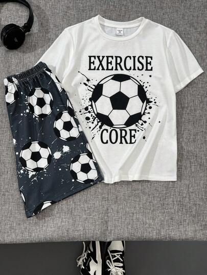 SHEIN Leap Crew 2 件套 Tween Boys 简约足球图案圆领短袖短裤休闲睡衣套装,阻燃 - 黑與白 - 查看 1