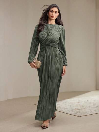 Veilorie 女士优雅纯色扭结腰部褶皱连衣裙,春秋季节朴素 - 綠色 - 查看 1