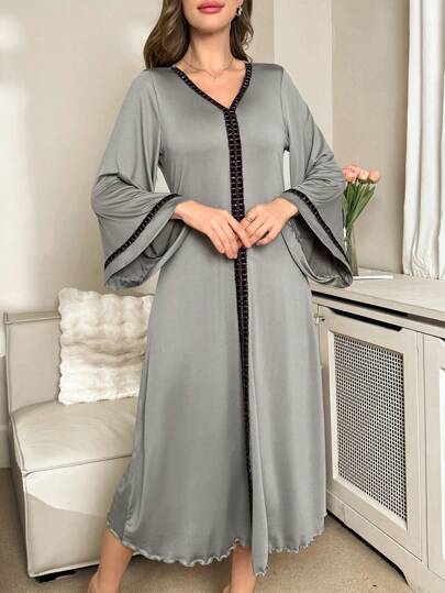 女式拼接亮片丝带 V 领长款睡袍 - 灰色 - 查看 1
