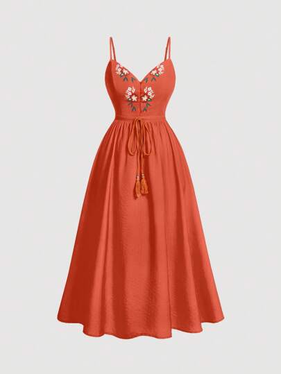 SHEIN MOD 大码前中花卉印花腰部喇叭下摆橙色度假连衣裙 - 鏽棕色 - 查看 1