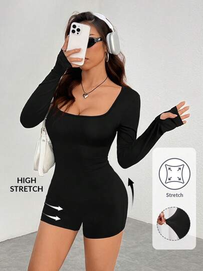 SHEIN PETITE 黑色针织方领紧身休闲运动瑜伽连体裤 - 黑色 - 查看 1