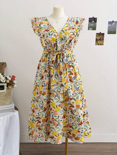 Soleia 大码女式春季花卉印花系腰深 V 领抽绳度假/海滩中长连衣裙 - 彩色 - 查看 1