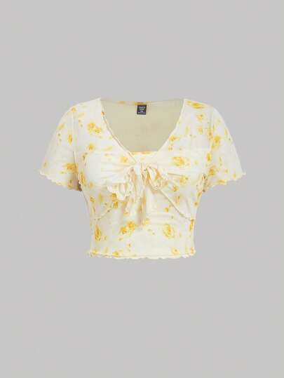 SHEIN MOD 加大码黄色浪漫花卉印花 T 恤,带荷叶边装饰肩带和正面扭结,适合夏季、外出上衣、加大上衣、上衣 - 黃色 - 查看 1