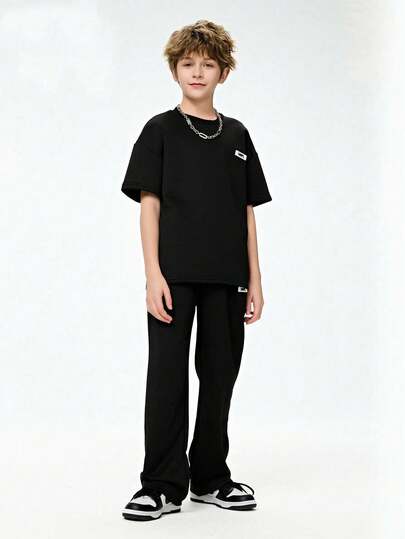 SHEIN Explorewe Tween Girls 2 件套 - 短袖圆领 T 恤和休闲裤,简约时尚服装 - 黑色 - 查看 1