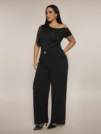SHEIN BAE 大码女式黑色口袋纽扣阔腿裤、办公室口袋长裤、Y2K 喇叭裤、派对裤、毕业典礼、音乐会、生日、海滩、度假、俱乐部、夜间外出、夏季裤、夏季、女士春季、音乐会、狂欢、节日、度假、西部、极简主义、辣妹、夏季女式裤 - 黑色 - 查看 1