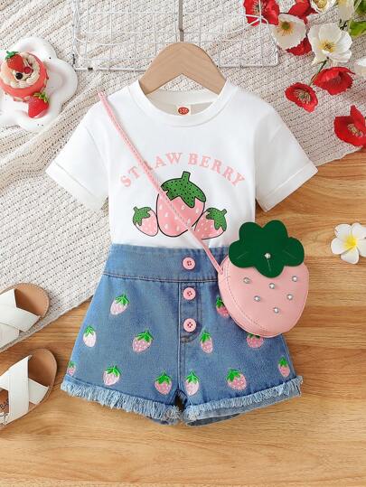 年轻女孩时尚休闲可爱草莓印花 T 恤和刺绣牛仔短裤套装(带包) - 淺粉色 - 查看 1