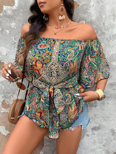 Breezaya 大码女式露肩印花衬衫 - 彩色 - 查看 1