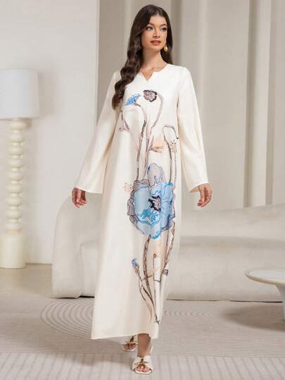 朴素长款印花卡夫坦印花女式连衣裙,采用混纺面料制成,长款宽松阿拉伯连衣裙,阿巴亚 - 彩色 - 查看 1