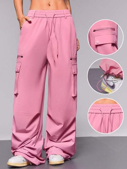 SHEIN Sports 女士休闲纯色抽绳腰部工装户外裤 - 粉色 - 查看 1