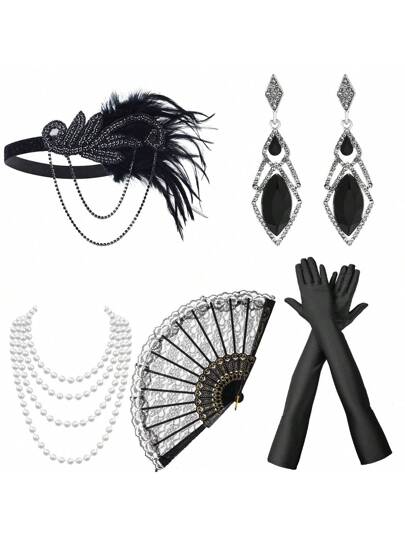 7 件 1920 年代女士派对化妆化妆舞会头饰、耳环、羽毛头饰、手套、手镯、烟嘴、蕾丝手扇、5 件套派对服装套装,适合万圣节派对舞会 - 黑色 - 查看 1