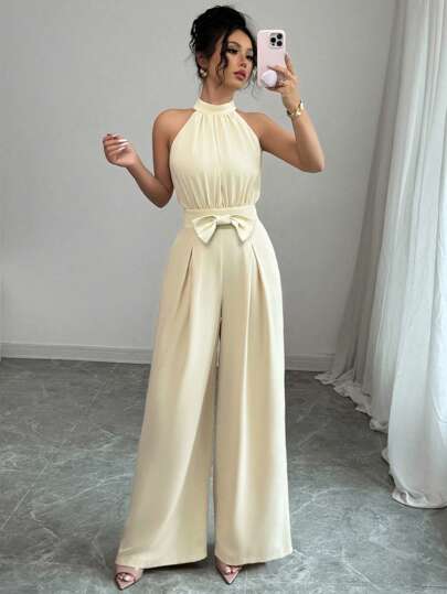 Elenzga 夏季优雅无袖立体蝴蝶结休闲连体裤适合春夏秋冬季节,演唱会女装,优雅,晚礼服,适合日常,通勤,婚礼季节 - 杏色 - 查看 1