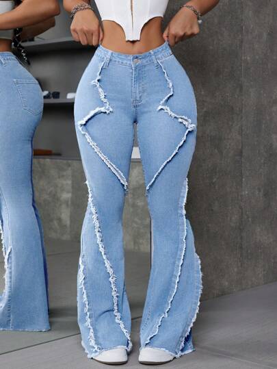 SHEIN ICON 拼接剪邊修身喇叭牛仔褲 - 淺色水洗藍 - 查看 5