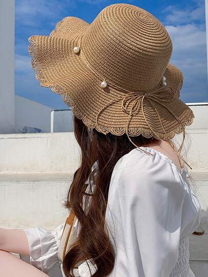 女士宽边草编太阳帽,适合夏季海滩,休闲波西米亚复古风格,优雅的 UPF 防护帽,带蝴蝶结装饰,适合春夏季 - 草帽 - 查看 1