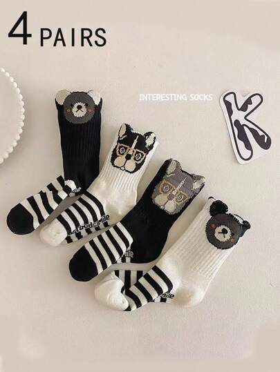 4 双彩色卡通条纹可爱熊和狗图案柔软舒适百搭男女通用儿童中筒袜,春夏 - 彩色 - 查看 1