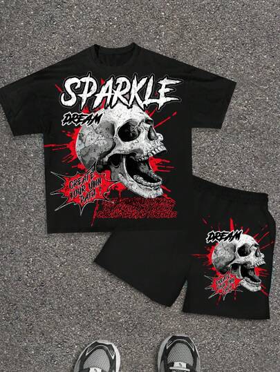 SHEIN 2 件套青少年男孩休闲短袖 T 恤和短裤套装,街头朋克摇滚学院休闲装,适合派对、音乐节,适合春夏季。骷髅英文印花,黑色 - 紅色 - 查看 1