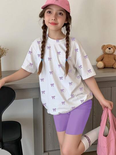 SHEIN Leap Crew 2 件套 Tween 女童休闲简约短袖 T 恤和短裤套装,夏季 - 彩色 - 查看 5