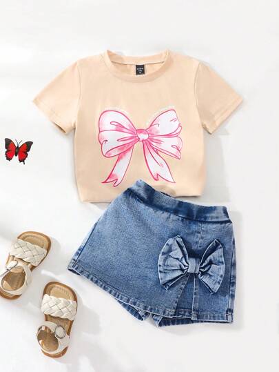 SHEIN 2 件套年轻女孩可爱学院风粉色蝴蝶结图案宽松柔软黑色 T 恤和紫红色蝴蝶装饰牛仔短裙,做旧水洗 - 杏色 - 查看 1