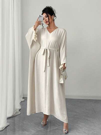 Elenzga 大码优雅简约流苏细节宽松休闲连衣裙 - 杏色 - 查看 1