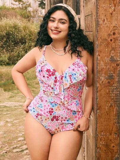 Swim Mod 1 件大码女式可爱随机花卉印花荷叶边可调节肩带连体泳衣,假日海滩度假 - 彩色 - 查看 1